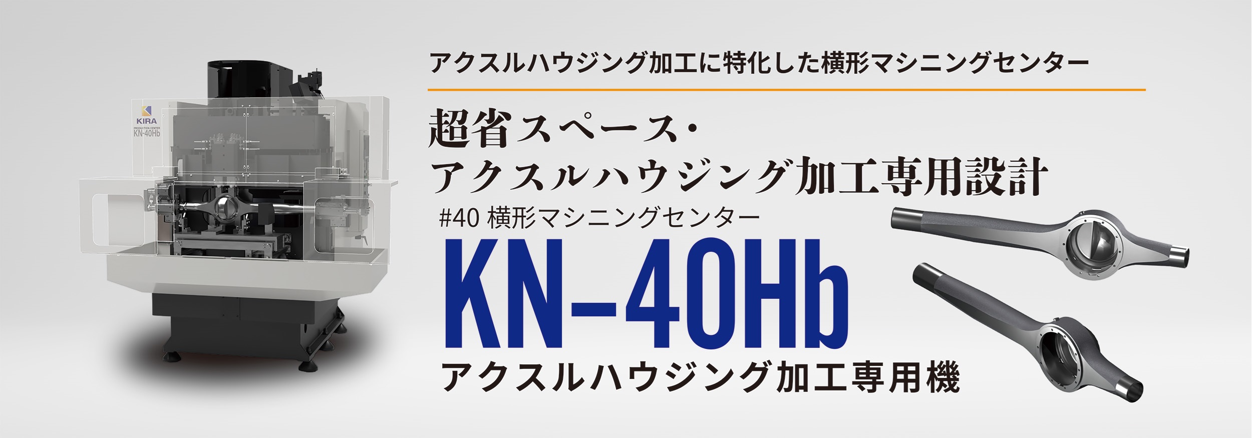 トラックなどに使われるアクスルハウジングの加工を、省スペースに設計された横形マシニングセンターで加工します。元々コンパクトなKN-40Hbを、アクスルハウジング加工用に専用設計して、無駄なく省スペース化しました。機械が占めるフロアスペースの削減に貢献します。また、自動化を考慮した構造にすることで、搬送を含めたラインレイアウトも自由度が高く、ワーク搬送なども容易になり、スムーズな工程間のワーク移動が可能になります。製造現場へ革命を起こす超省スペースマシニングセンターです。